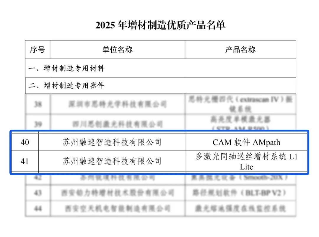 近日,中国增材制造产业联盟公布了《2025年增材制造优质产品名单》。融速科技自主研发的激光送丝增材平台Laser One、多激光同轴送丝增材系统L1 Lite、CAM软件AMpath三款产品在全国遴选中脱颖而出,成功上榜。