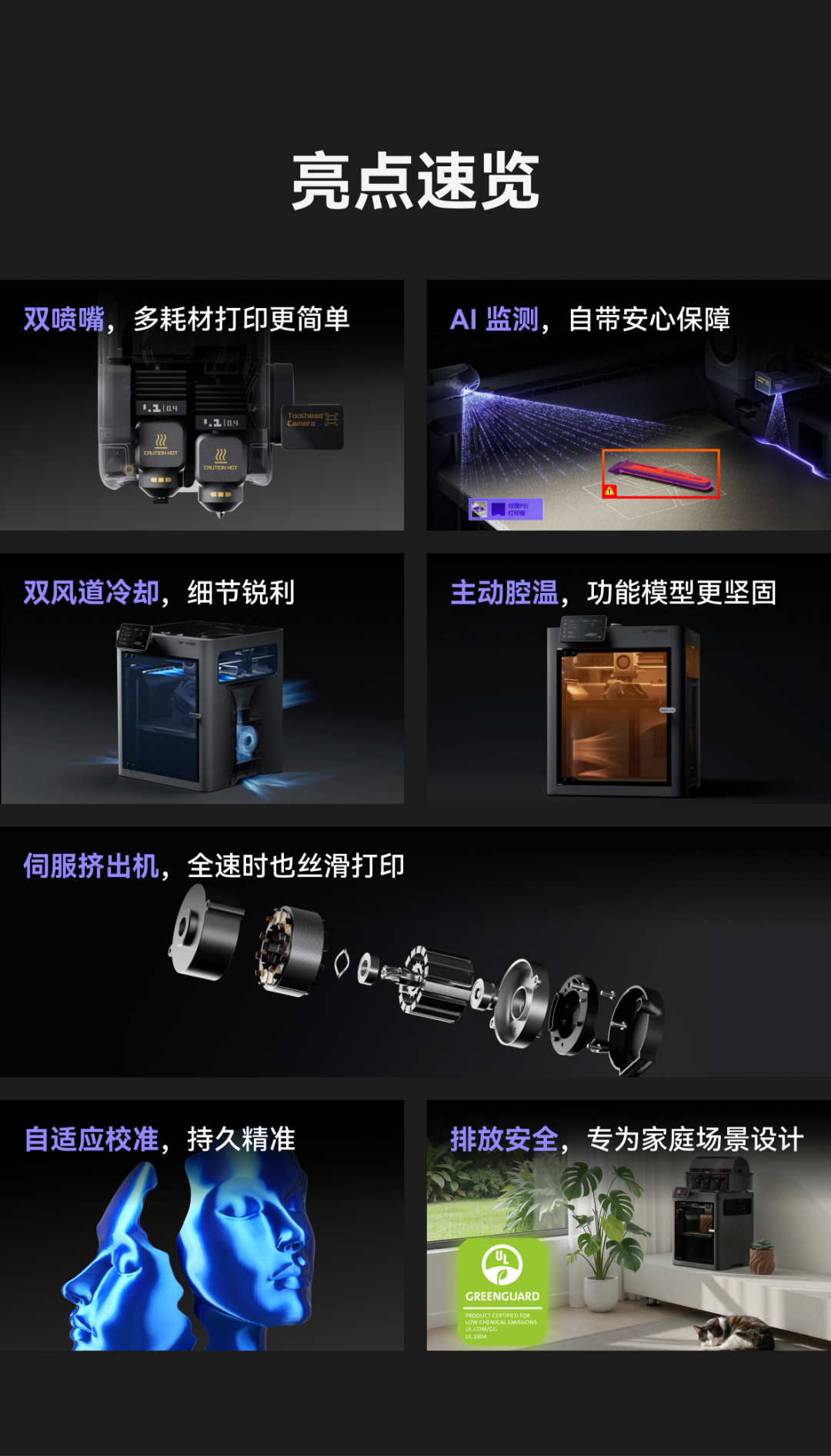 :双喷嘴经百万次切换测试依旧顺滑;免工具快换喷嘴,支持远程监控与延时摄影,固件定期迭代升级,持续优化功能与性能。