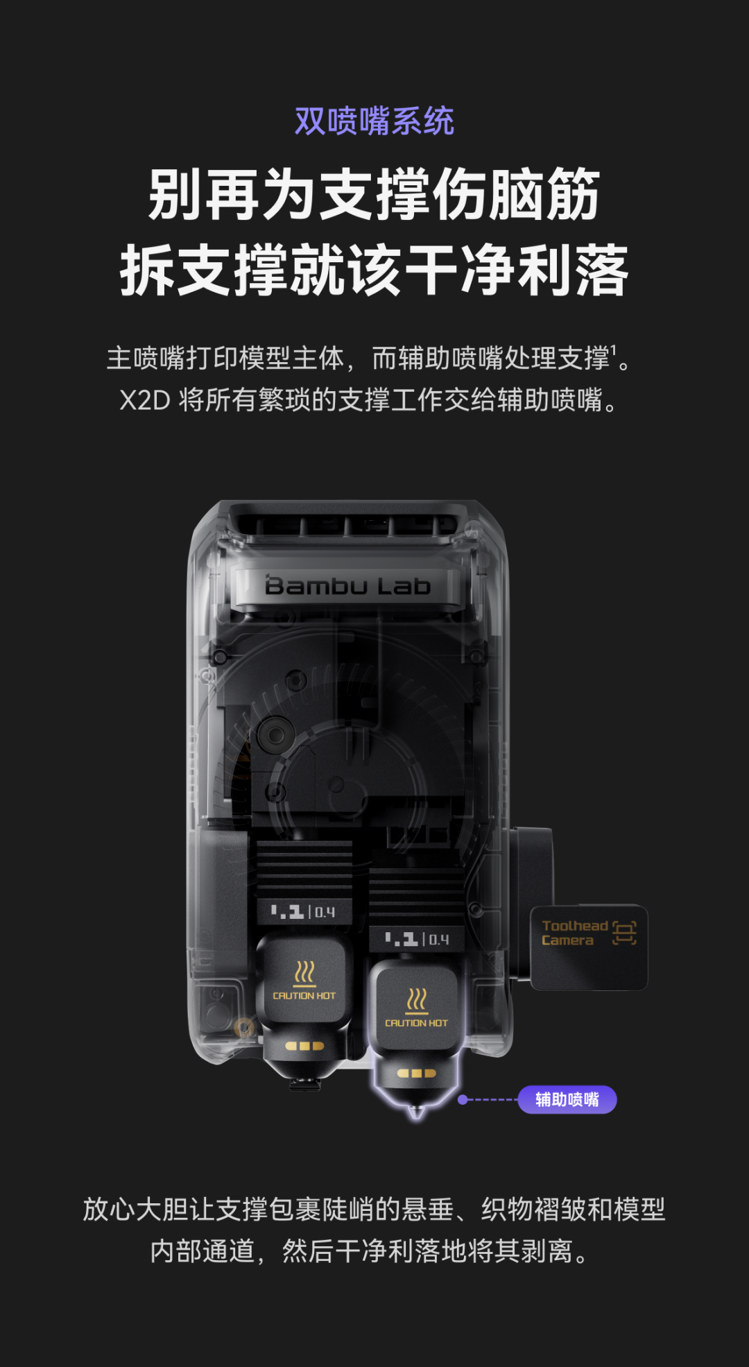 :主喷嘴负责模型主体,辅助喷嘴处理支撑,剥离干净、无残料;支持 TPU+PLA 等多材料一次性混打,快速换色、过渡清晰、耗材损耗更低。