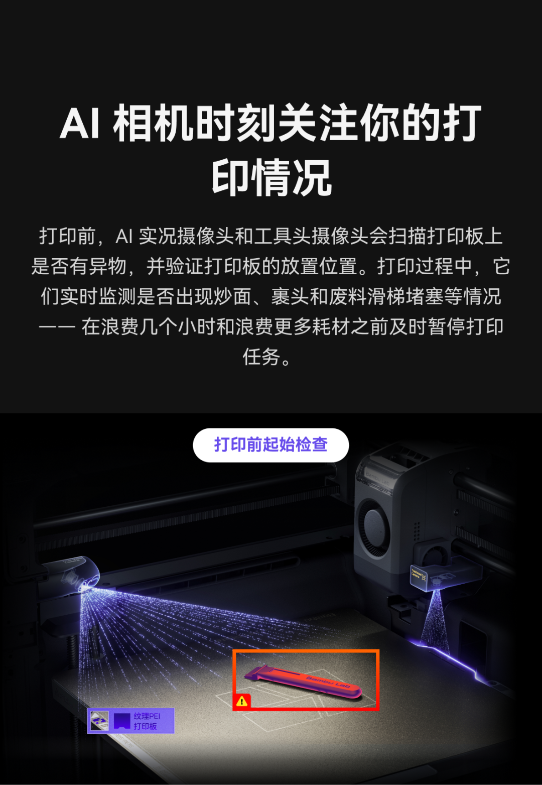 :AI 相机完成打印前平台检查,打印中实时识别堵料、裹头、“炒面” 等异常,及时停机止损;整机配备 31 个传感器,覆盖进料、温控、安全等关键环节。
