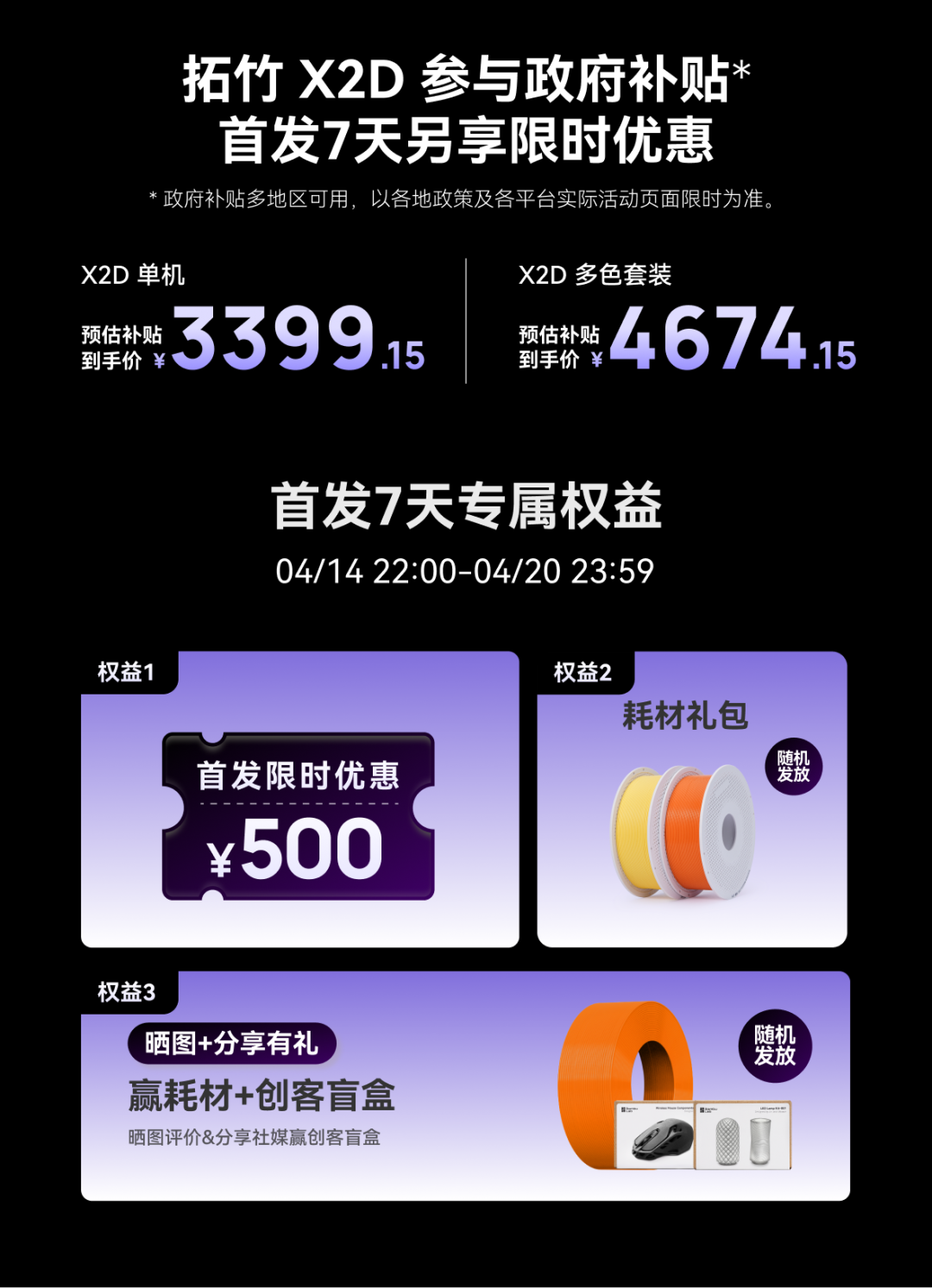 X2D 多色套装:5999 元,政府补贴后预估4674.15 元
